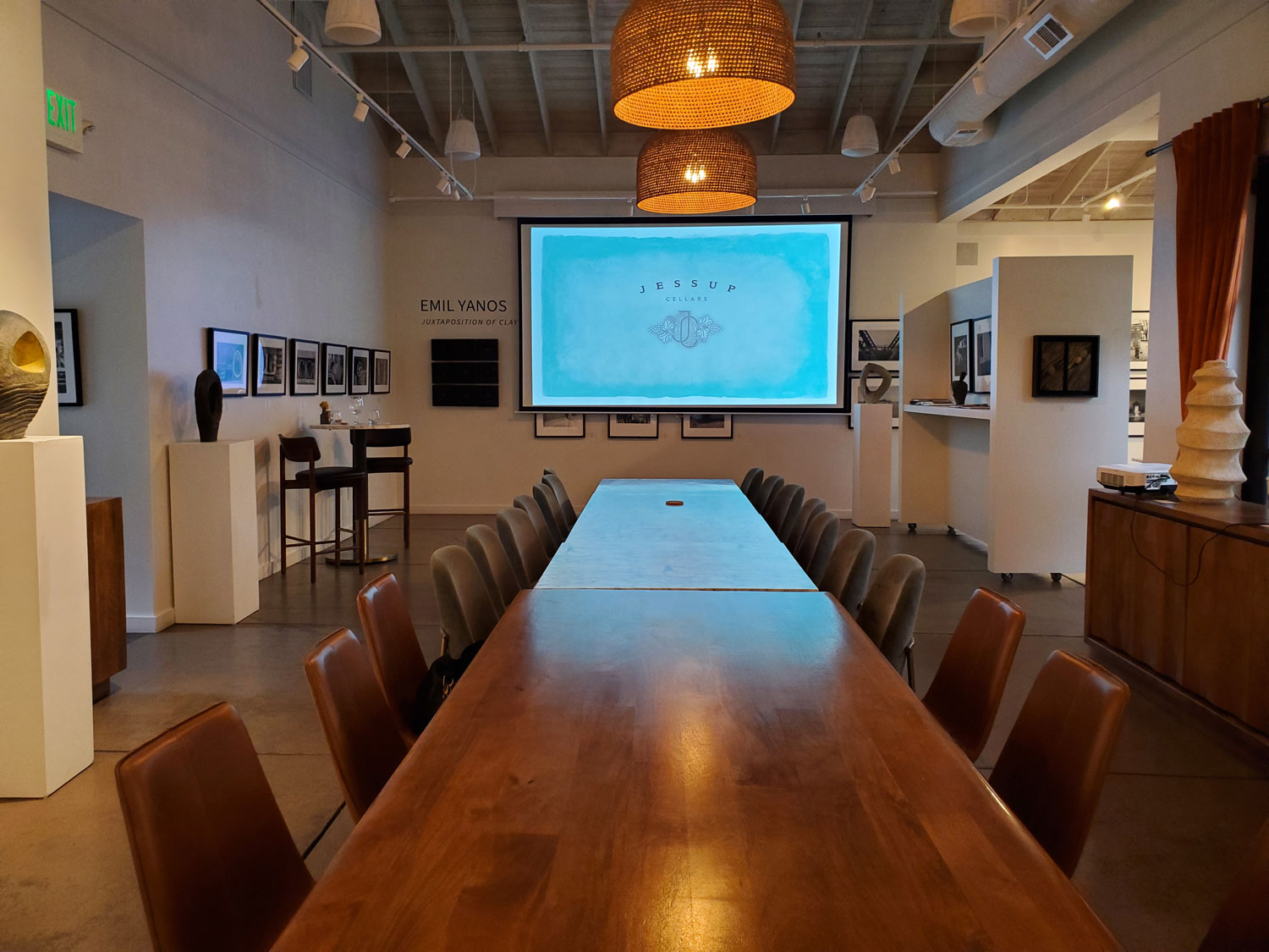 Our private space isn’t a typical conference room — it’s a beautifully curated gallery that sparks conversation and connection. Guests gather among original artwork while enjoying handcrafted Jessup Cellars wines, creating a setting that feels both creative and comfortable.